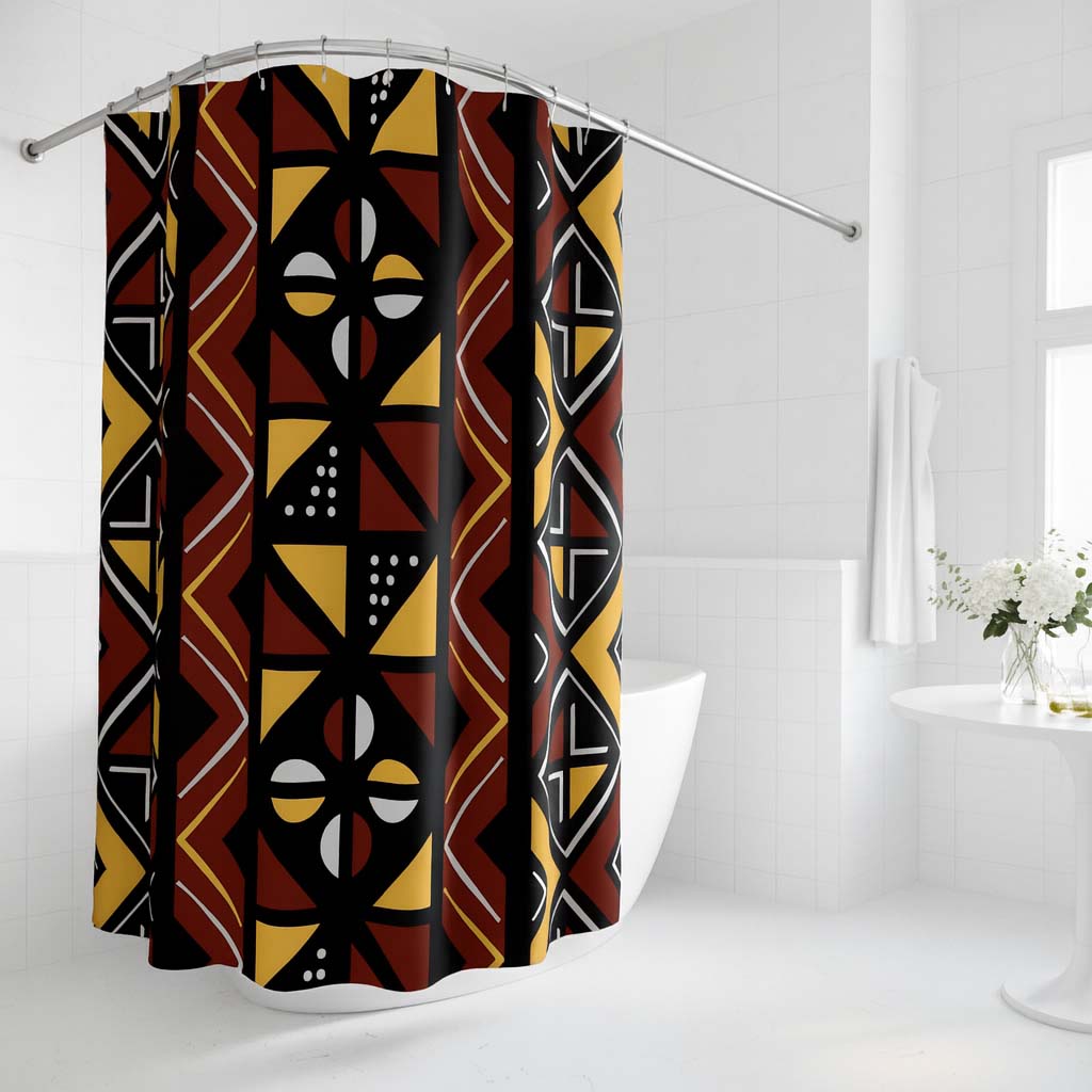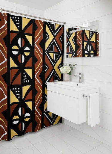 Decorate your bathroom with this stylish African shower curtain featuring an authentic Bogolan print. The rich colors and intricate designs add a unique decorative touch that will give your bathroom a beautiful ethnic look. Durable and machine-washable, this African shower curtain is the perfect addition to any bathroom.