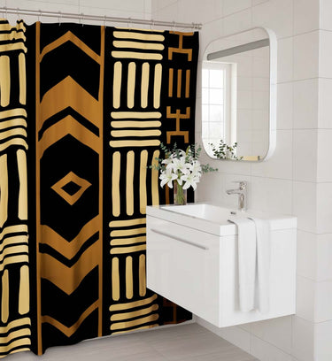 Unleash the daring adventurer in you with our Black and Gold Shower Curtain Ethnic Print. Make a bold statement and add a touch of adventure to your bathroom decor. With its stunning design, this shower curtain will transport you to exotic locations every time you shower!