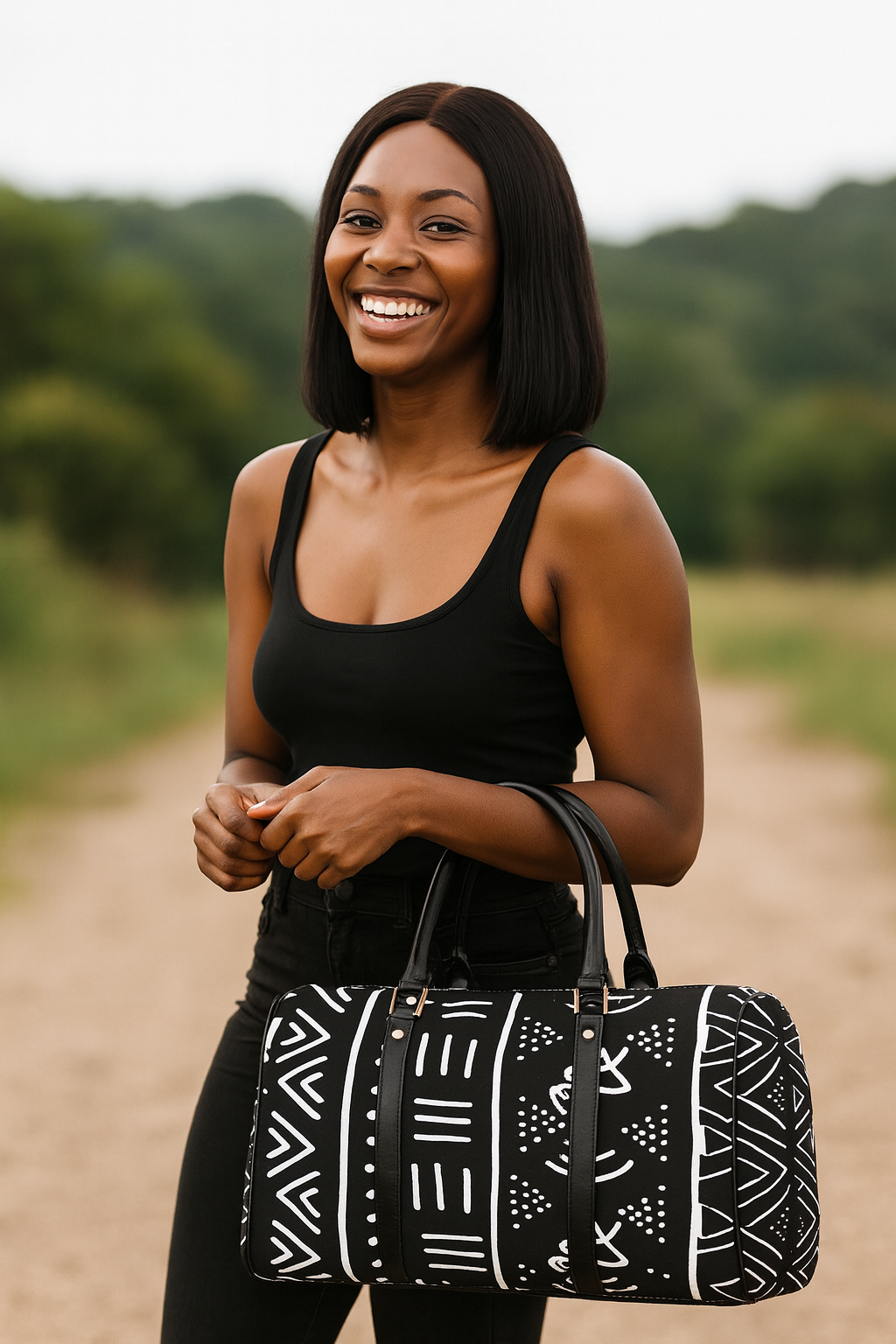 African Travel Bag Leather Mud Cloth Print Black & White