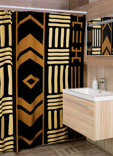 Unleash the daring adventurer in you with our Black and Gold Shower Curtain Ethnic Print. Make a bold statement and add a touch of adventure to your bathroom decor. With its stunning design, this shower curtain will transport you to exotic locations every time you shower!