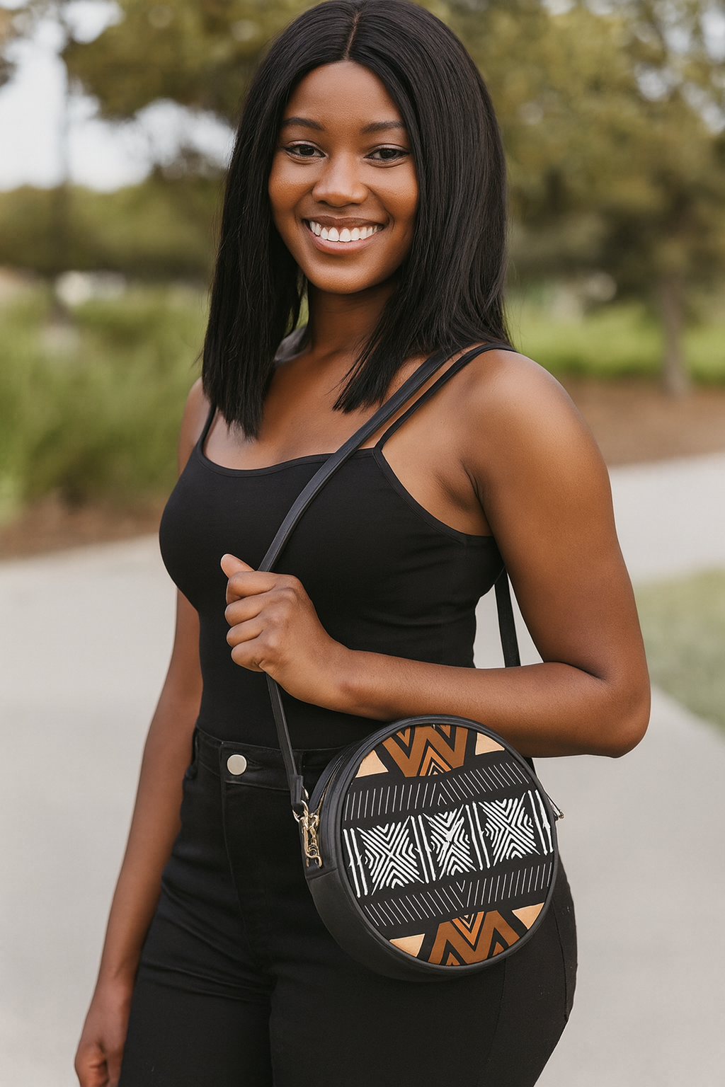 Introducing our Black Bag Crossbody Round Sling Mudcloth Print, the perfect combination of style and functionality. Made with a chic mudcloth print, this bag is both trendy and durable. With a crossbody design and a round shape, it offers convenience and comfort for any occasion. Elevate your wardrobe with this must-have accessory.